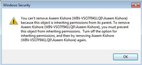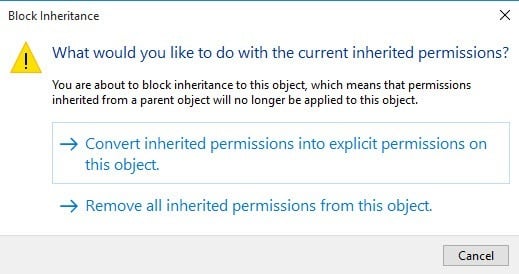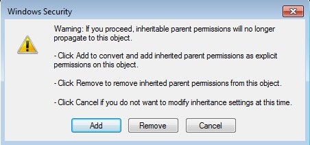 When you do that, another dialog box will popup and it will ask you whether you want to convert the inherited permissions to explicit permissions or whether you just want to remove all the inherited permissions.