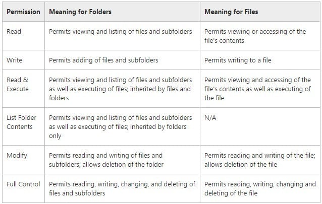 So what do each of these permissions mean? Well, here is a nice chart from Microsoft’s website that breaks on what each permissions means for files and for folders: