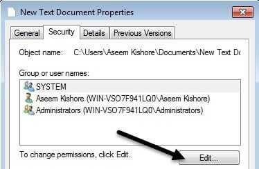 If you right-click on a file or folder, choose Properties and click on the Security tab, we can now try to edit some permissions. Go ahead and click the Edit button to get started.