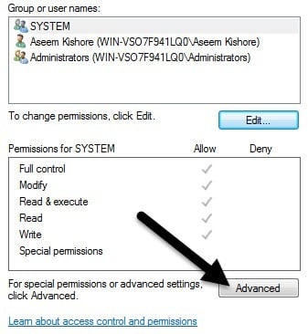 On Windows 7, you’ll one extra tab for Owner. In Windows 10, they just moved that to the top and you have to click Change. Anyway, in Windows 7, click on** Change Permissions** at the bottom of the first tab.