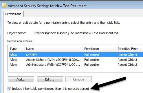 On the Advanced Security Settings dialog, uncheck the Include inheritable permissions from this object’s parent box.