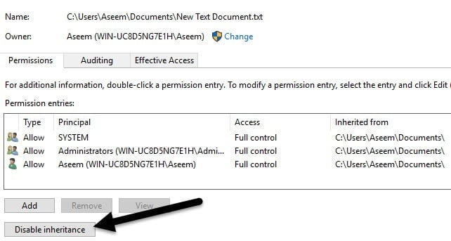 In Windows 10, it looks slightly different. After clicking on the Advanced button, you have to click on Disable Inheritance.