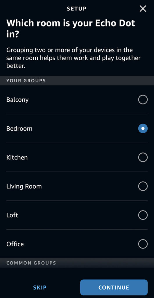 - Select the room your Echo Dot will be in, and tap **Continue.**