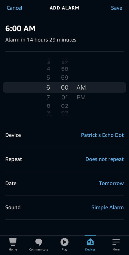 - Select the time you want the alarm to go off, the devices you want the alarm to trigger, the date or dates, and the sound, then select **Save.**