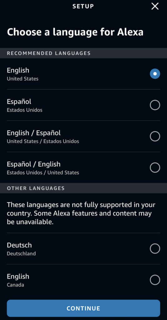 - Next, select a language for Alexa to use. Tap **English** and then tap **Continue.**