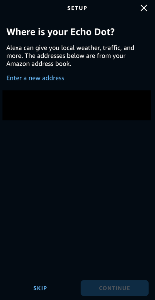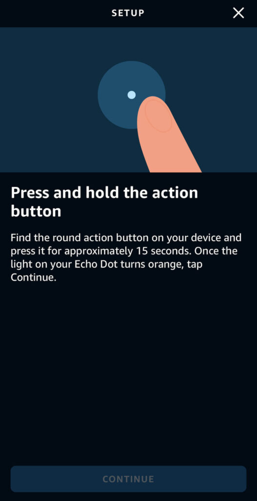 - Follow the on-screen instructions to complete the setup. For the Echo Dot used in this example, you should press the physical action button on the device next. Tap **Continue** again.
