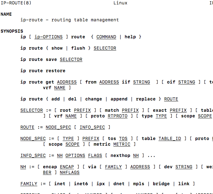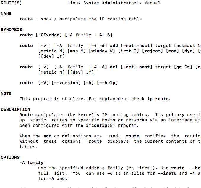 The following image shows a screenshot of the man page for “Route” and the directives that are possible with that tool.
