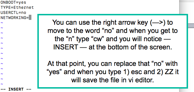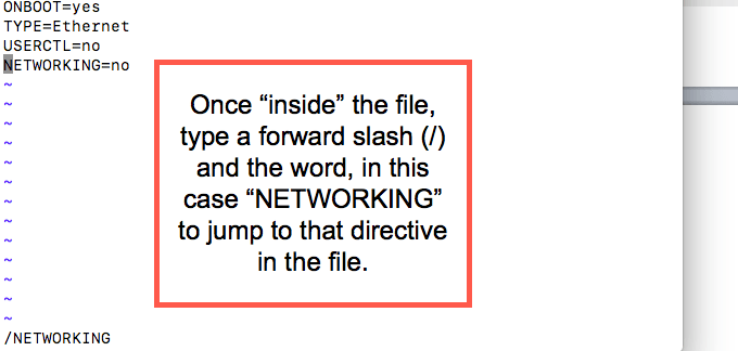 - Now that you’ve made a backup of the configuration file,, it’s time to make changes to that configuration file. If you’re using the vi editor, you would type the following: vi ifcfg-eth0 After doing so, the file will open in the terminal/command application (similar to the way a man page opens when you trigger it). Once the configuration file is open, you would look for the line that includes “NETWORKING=no” and delete that line or change it to “NETWORKING=yes”. This can be done with the “cw” directive in the vi editor. By typing a forward slash, you’re telling the vi editor that you’re searching for something. In this case, you let the editor know that you are searching for “NETWORKING” and when it’s found (directing the mouse to that location) you can use the right arrow key to move to the word “no”. When you get to the word “no”, stop on the “n” and type “cw” allowing you to change the “no” to “yes.” The “cw” stands for change word and Linux allows you to change the entire word from one word (“no”) to another (“yes”). If you only wanted to change one letter, you could use an “r” to replace one letter or character. The screenshots show this process below.