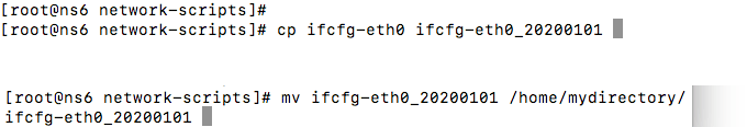 - Make a copy of the configuration file, to be safe. There are a few ways to do this. One of the easiest is with the command window. Type: cp ifcfg-eth0 ifcfg-eth0_20200101 Then on the next line, type: mv ifcfg-eth0_20200101 /home/mydirectory/ifcfg-eth0_20200101 This moves the file copy you just made to a directory you’re using for backups.