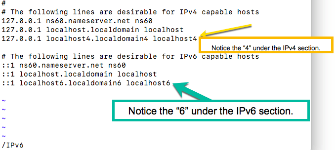 - Modify the hosts configuration file by typing the following in the command line app:sudo vi /etc/hosts