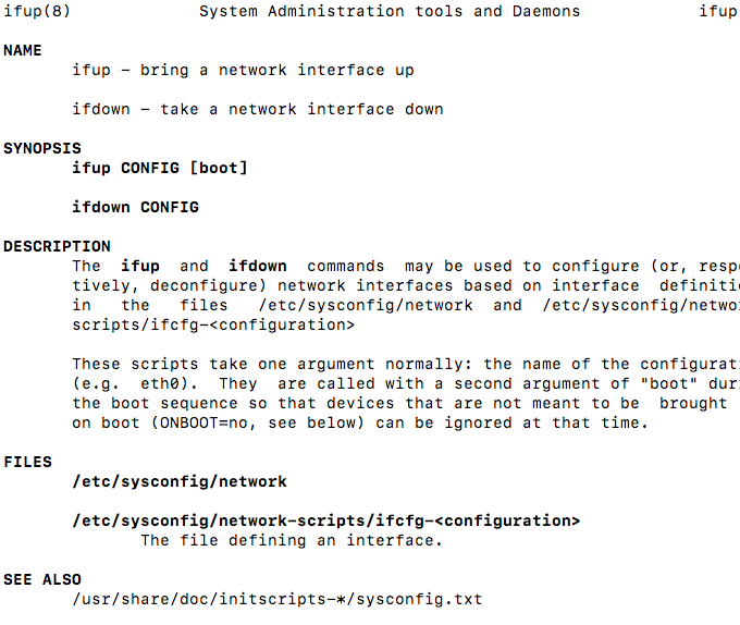 In accessing the man pages, we’re able to review information about the ifcfg script that replaced the ifconfig script (as shown in the above screenshot of the man page). Also, when looking at the list of interfaces in the Linux distribution, we notice the ifup and ifdown commands. Those, too, can be reviewed in their man page(s).