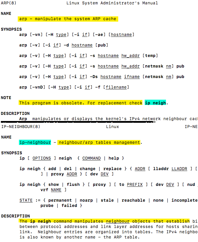 In the image below, the man page for ARP indicates that ARP is obsolete (under the “notes” section) and that one should look up ip neigh instead. It would seem, by that notation, that one may want to type “man ip neigh” to access information about the replacement tool/protocol.