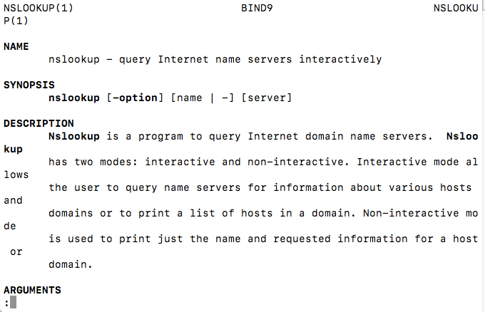 As an example, try looking up the man page for the nslookup tool. You do this by typing “man nslookup”. When you do that, you’ll see a man page that looks similar to the image/screenshot below. You’ll learn all you’d want to know about the nslookup tool.