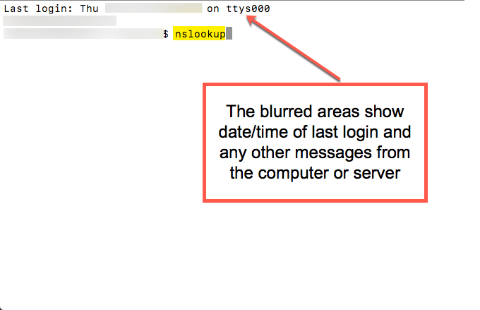 NSLookup is a handy tool. In this case, we are using it to look up information about eBay. In order to do so, we type “nslookup ebay.com” and we’re presented with information that’s similar to what’s shown in the image below. The command is displayed at the top of the screenshot (after the blurred out private information). Then, the output from that request (the nslookup) is shown below that, with information such as Server (the public IP address), the specific IP address, etc.