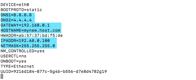 The choice is yours and should be based on whatever method is easier. The file represented by the screenshot below is accessed via the following command: sudo vi /etc/sysconfig/network-scripts/ifcfg-eth0
