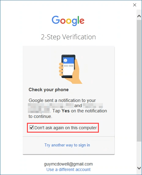 - If you have Two Factor Authentication (2FA) set up on Gmail, and you should, Google will ask you to verify through that second method. If you want to use 2FA every time you use Outlook for Gmail, uncheck the **Don’t ask again on this computer**. Otherwise, leave it checked.