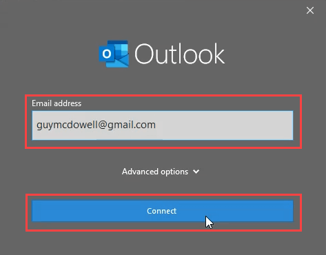 - Outlook will ask you for an email address to set up. Enter your Gmail address and click on **Connect**.