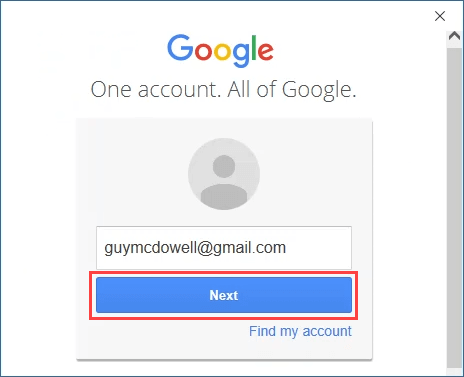 - A new window will open from Google. It should be pre-filled with your e-mail address. Make sure it’s correct and click **Next**.