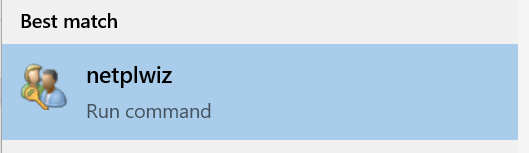 - In the Windows 10 search box or the Run command box (Windows key + R), type **netplwiz **or control userpasswords2.