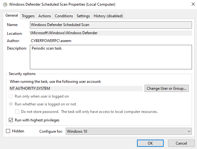- Double-click on Windows Defender Scheduled Scan (shown in the screenshot above). Another box will open with several options. The settings in the popup will enable you to customize the criteria for your scans. These settings are called Triggers.