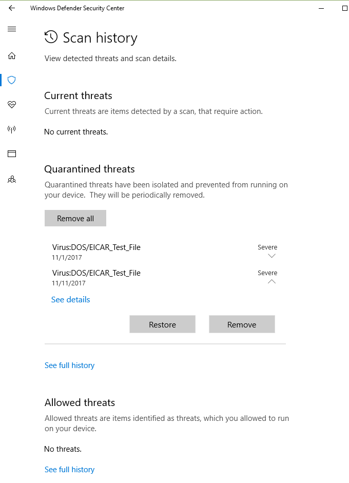 - Check the box next to the threat and either Remove or Restore it. Microsoft recommends not restoring anything with a high or severe threat rating.