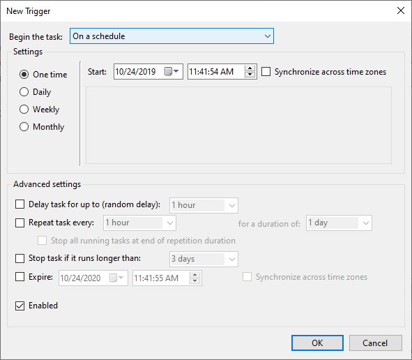 For the Daily option, you will be prompted to select the start date and time. If you want to Synchronize across all time zones, tick off the box.
