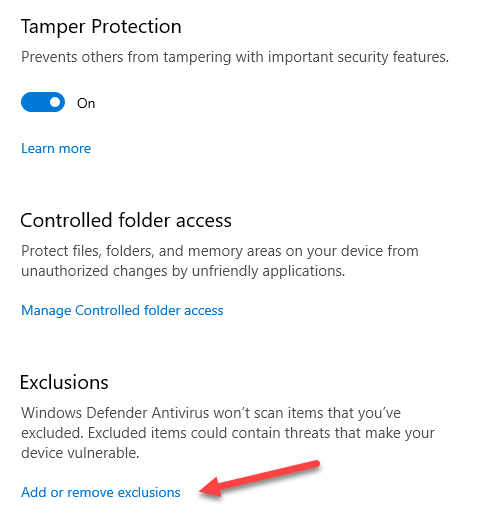 To exclude any file or folder from a scan, click Manage settings from the Virus & threat protection settings screen and then scroll down to click on Add or remove exclusions.