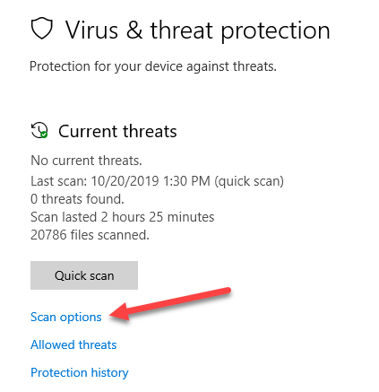 Follow the steps outlined above to go to the Virus and threat protection screen and then click on Scan options.