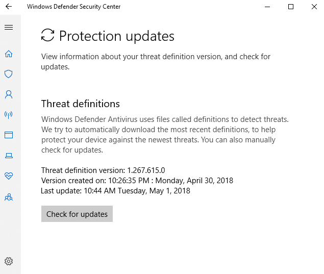 Windows Defender detects threats to your computer by files called definitions. When Microsoft finds new viruses, malware, or spyware, they add it to a list. Click on Check for updates under Virus and Threat Protection Updates.