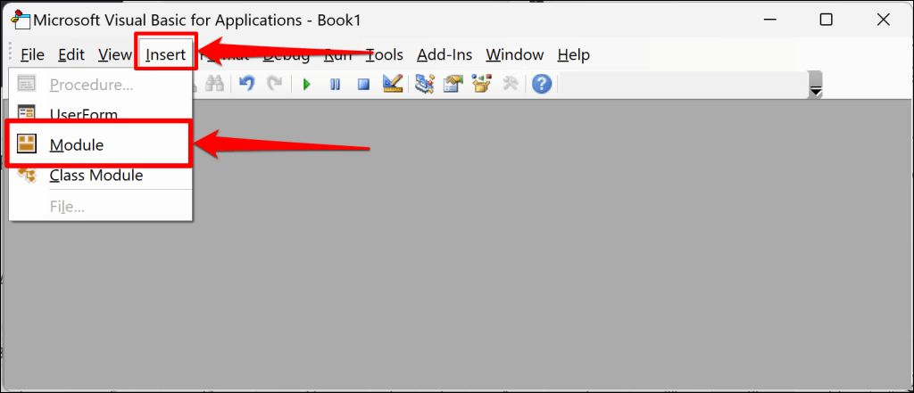 - Select Insert on the top menu and choose Module.