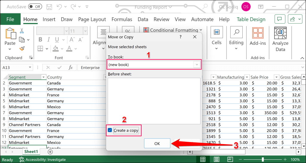 - Select (new book) in the “To book” drop-down menu and check the Create a copy tickbox. Select OK to close the dialog box.