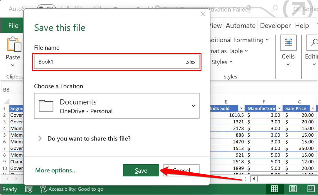 - Enter a file name and select Save. Ensure you save the workbook in “.xlsx” format so the recipients can view or edit the sheet in Excel.