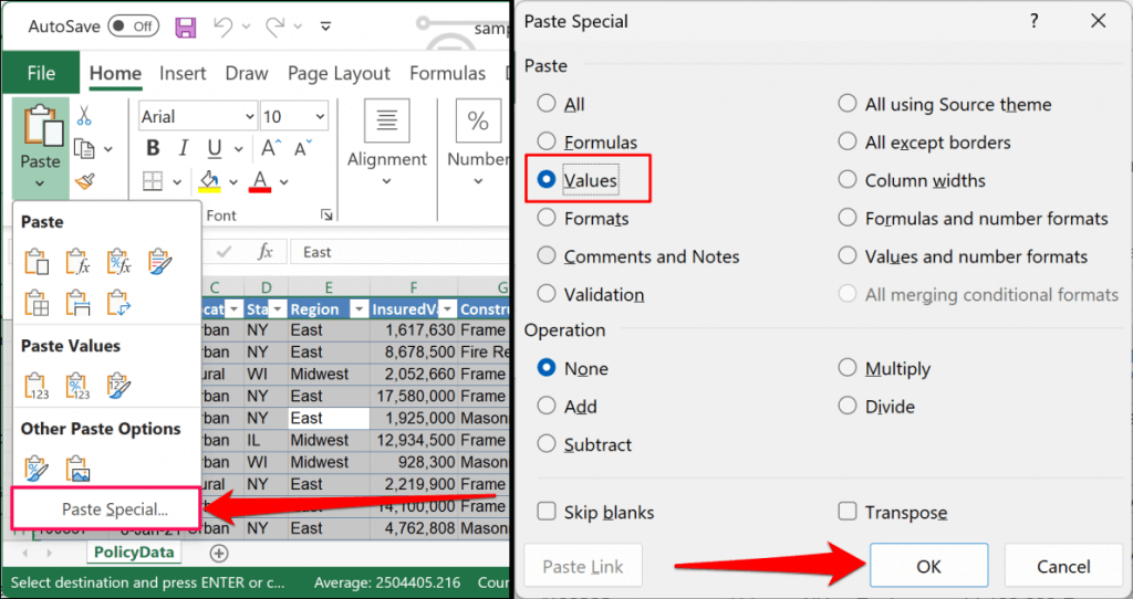 Alternatively, select Paste Special, choose Values in the “Paste” section, and select OK.