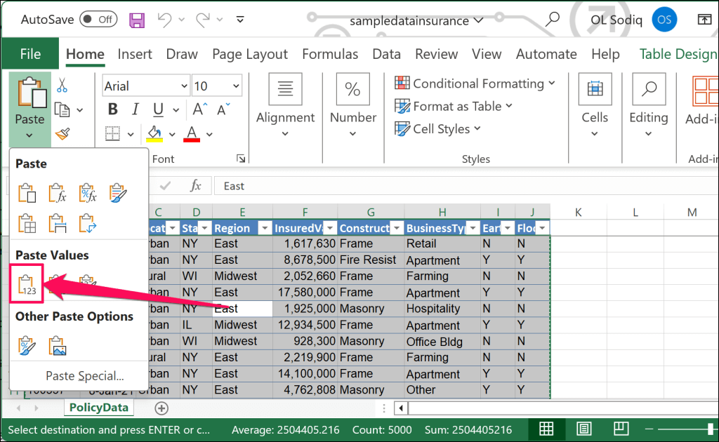 - Next, select the first icon (Values) in the “Paste Values” section.