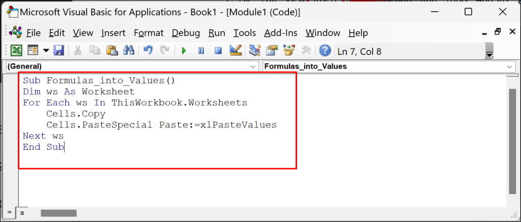 The Visual Basic for Application (VBA) tool can help convert cell content in an Excel worksheet to values only. If this is your first time running VBA in Excel, our VBA guide for beginners is a must-read.