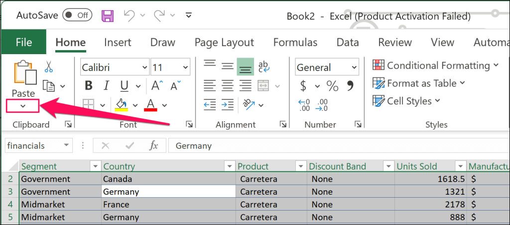 - Press Ctrl + C (Windows) or Command + C (Mac) to copy the selected cells. * Again, press Ctrl + A (Windows) or Command + A (Mac) to copy the entire worksheet. * Open the Home tab and select the down-arrow icon below the Paste icon in the “Clipboard” section.