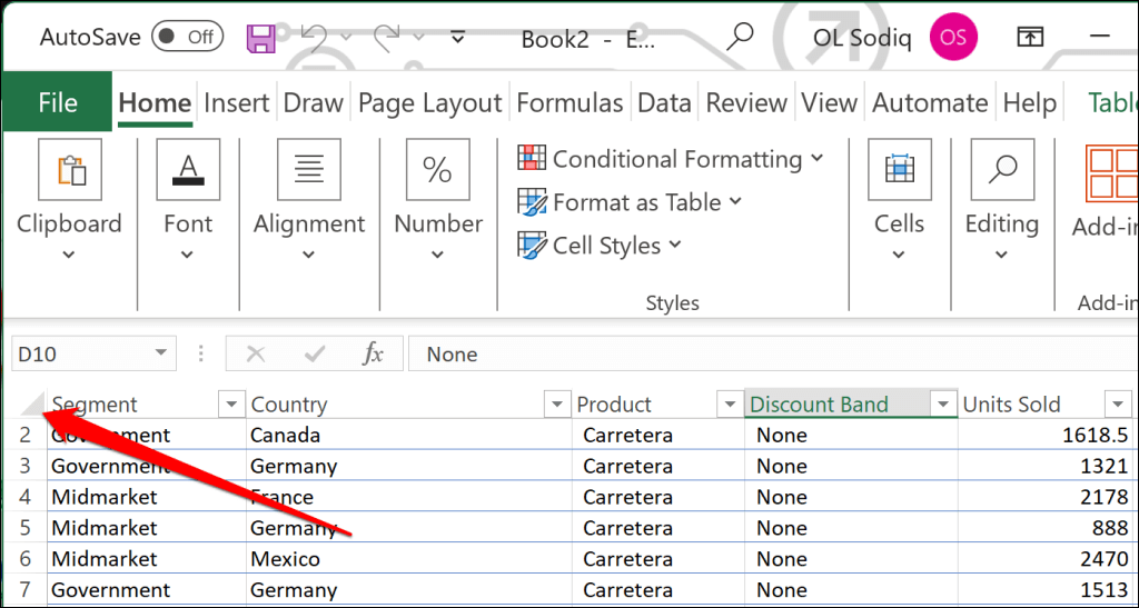 - Press Ctrl + A (Windows) or Command + C (Mac) to select all cells in the new (duplicate) worksheet. Alternatively, select the Triangle icon in the top-left corner of the first row and column.