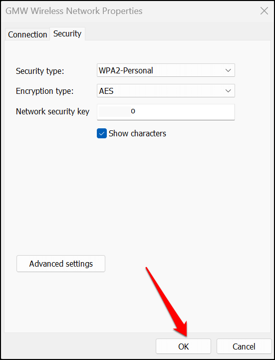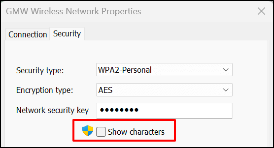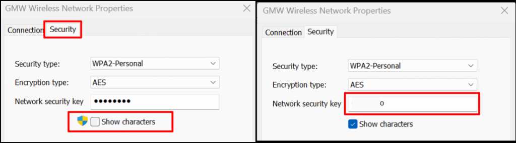 - Head to the “Security” tab on the Wi-Fi status page and select the **Show characters** checkbox. You should see the Wi-Fi network’s password in the “Network security key” box.