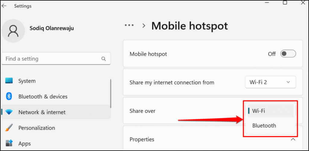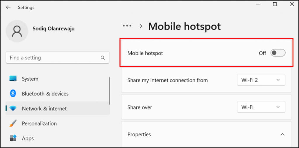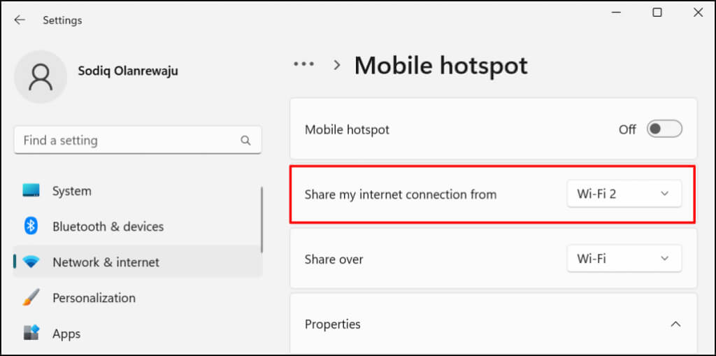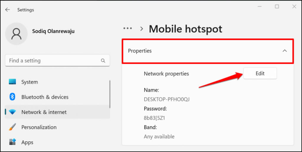 - If you choose to share your connection over Wi-Fi, expand the **Properties** section to check the mobile hotspot credentials. Select **Edit** to change the hotspot name and password.