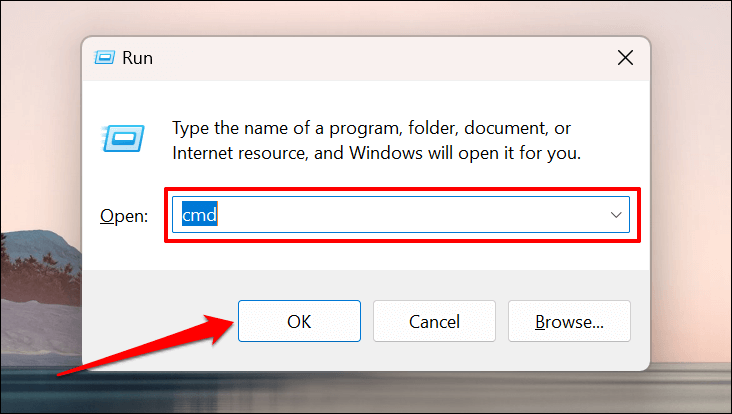 - Press the Windows key + R, type cmd in the Run box, and press Enter or select OK.