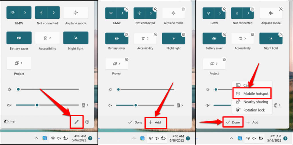 Press Windows key + A to open the Windows 11 Action Center and select the pen icon in the bottom-right corner. Select Add, choose Mobile hotspot, and select Done.