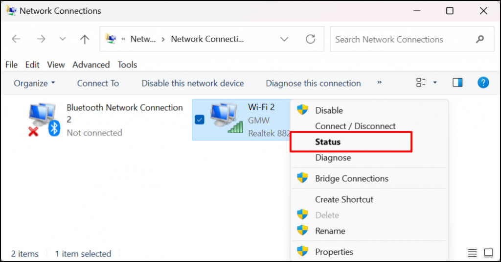- Right-click the Wi-Fi adapter of the active connection and select **Status**.