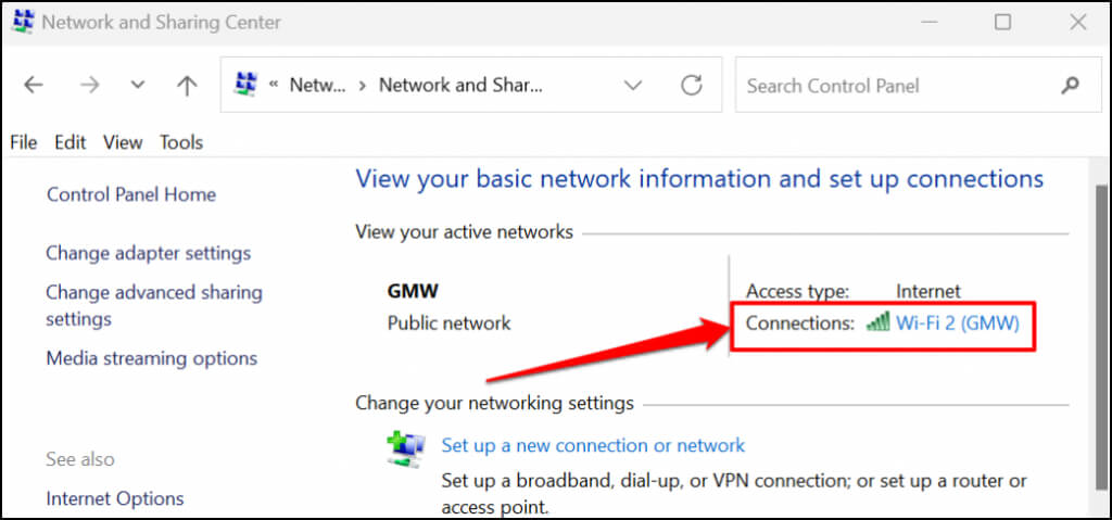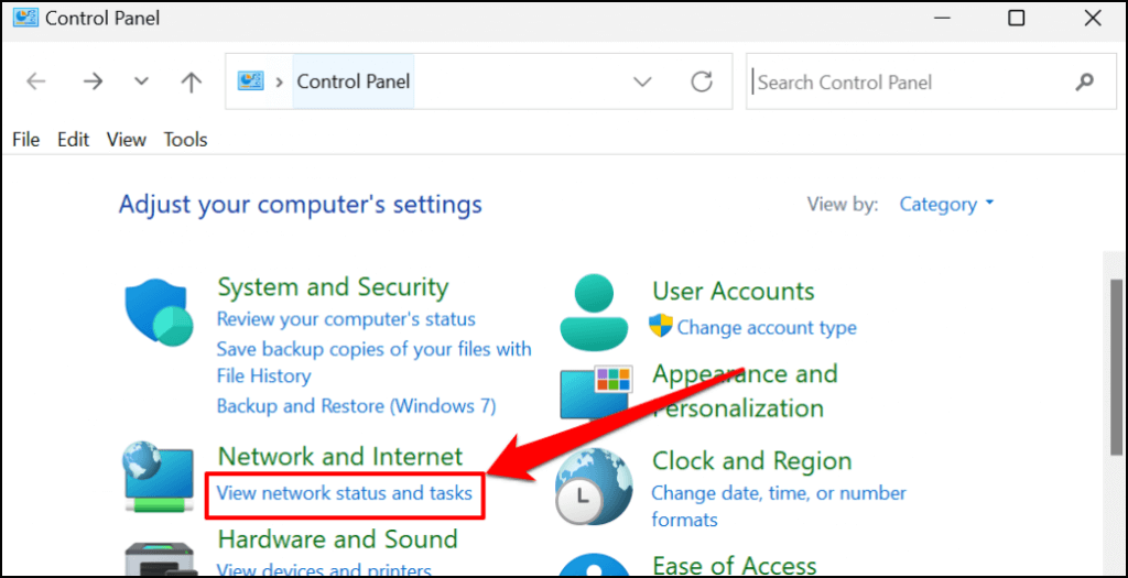 - Select **View network status and tasks** in the “Network and Internet” category. That’ll open the “Network and Sharing Center” window.