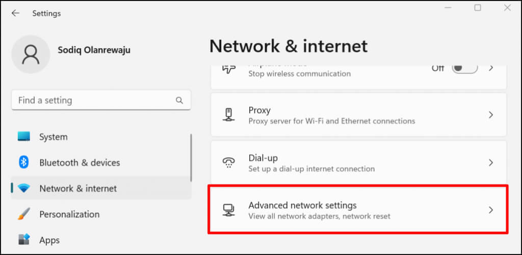 - Select **Advanced network settings** at the bottom of your Network & internet settings menu.