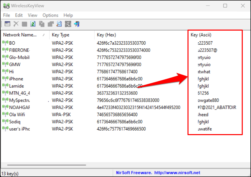 Install the WirelessKeyView software and launch the app. You’ll find information about all previously-used Wi-Fi networks on the app’s dashboard. Network passwords are in the Key (Ascii) row.