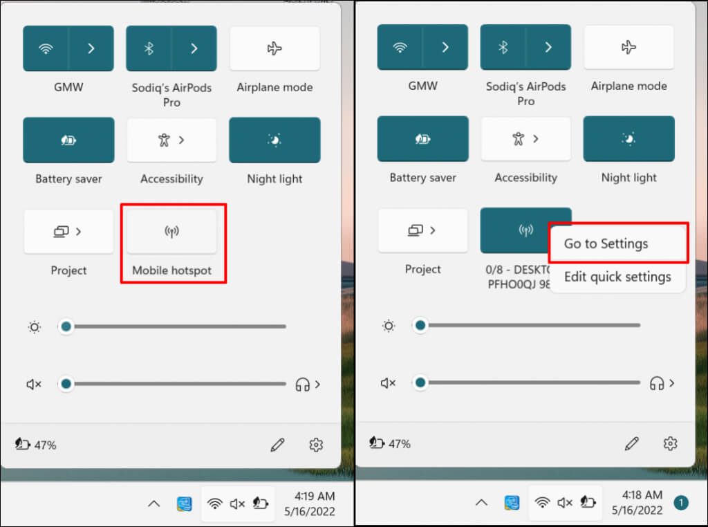 You should now be able to enable and disable mobile hotspot from the Action Center. To open the Mobile hotspot settings, right-click on Mobile hotspot and select Go to Settings.