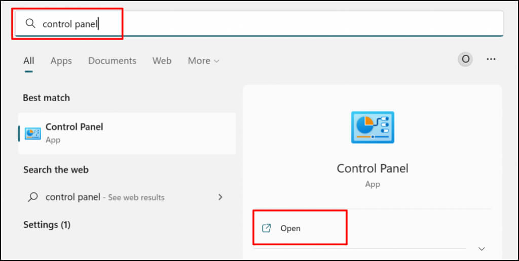 - Type control panel in the Windows Search bar and select Open below the Control Panel app.