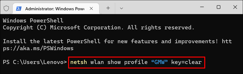 - Next, paste **netsh wlan show profile “Wi-Fi name” key=clear** in the Powershell terminal. Replace **Wi-Fi name** with the network’s name/SSID and press **Enter** to run the command.