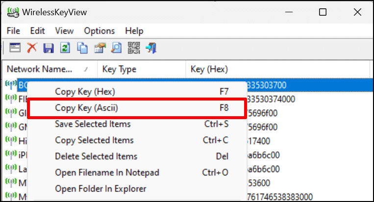 Select a network and press F8 to copy its password quickly. Alternatively, right-click the network and select Copy Key (Ascii).