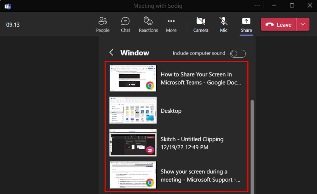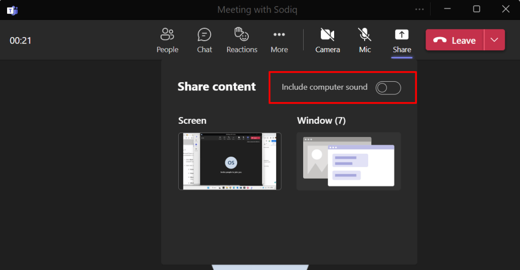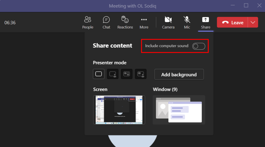 - Toggle on Include computer sound to share your computer’s audio and display. Leave the option disabled if you don’t want to share your computer’s audio.